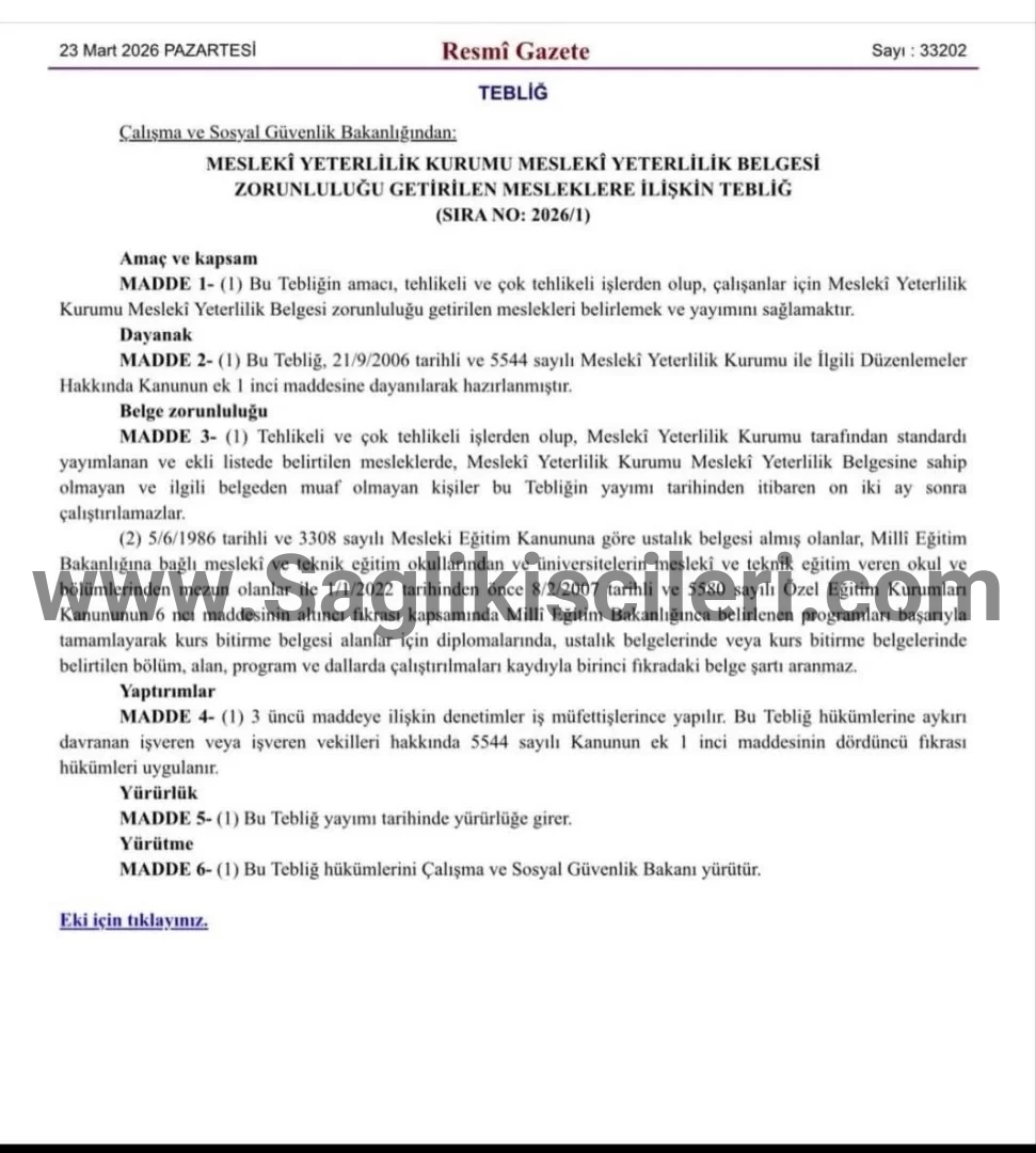 *Kaynak: 23 Mart 2026 tarihli ve 33202 sayılı Resmi Gazete – Mesleki Yeterlilik Kurumu Mesleki Yeterlilik Belgesi Zorunluluğu Getirilen Mesleklere İlişkin Tebliğ (Sıra No: 2026/1)*